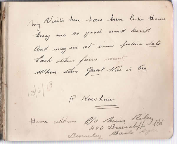 My visits have been like home every one so good and kind. And may we at some future date. Each others faces meet. When this Great War is over. R Kershaw 13/6/1918 Home address Care off Riley 400 Brierfield Road Burnley