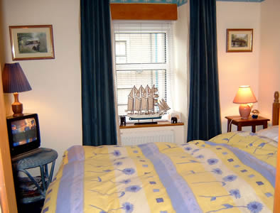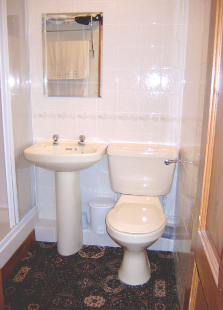 The bedroom has a double bed and built in antique pine wardrobe and two bedside Chests of drawers, colour TV. The shower room has a shower cabinet with instant electric hot water. A floor to ceiling pine cabinet with built in linen cupboard gives ample storage. |