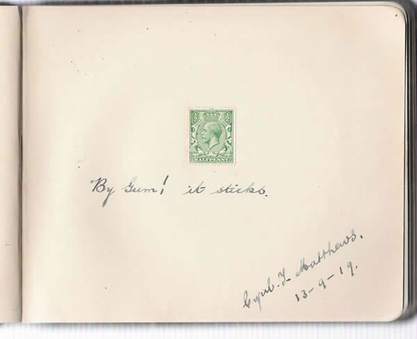 Autograph page with a halfpenny Stamp stuck in the middle of the page.