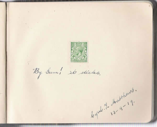 Autograph page with a halfpenny Stamp stuck in the middle of the page.